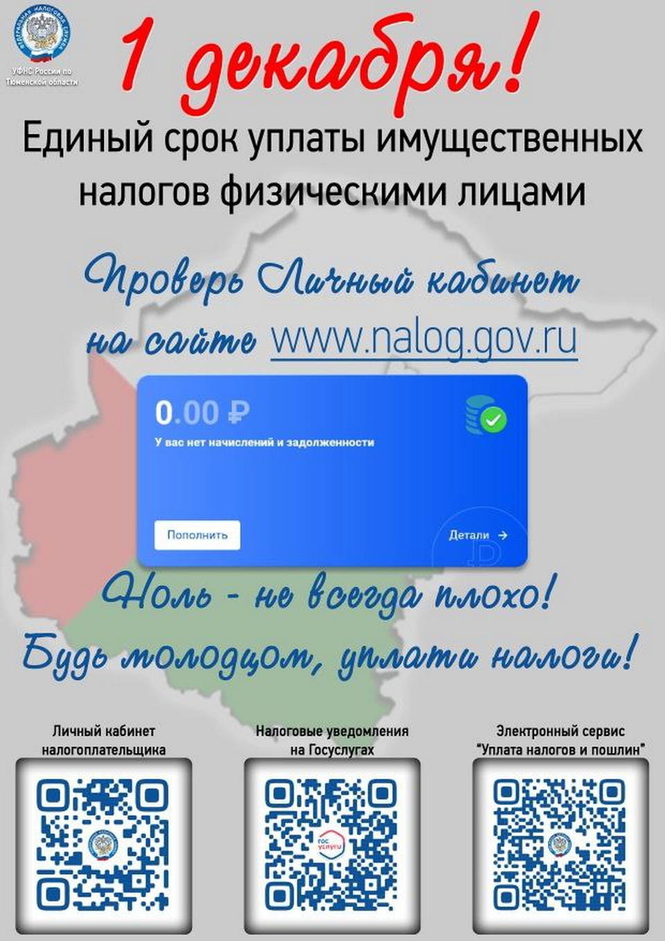 Межрайонная ИФНС России № 6 по Тюменской области сообщает о начале рассылки налоговых уведомлений за 2024 год. Срок уплаты имущественных налогов за 2024 год не позднее 1 декабря 2025 года.