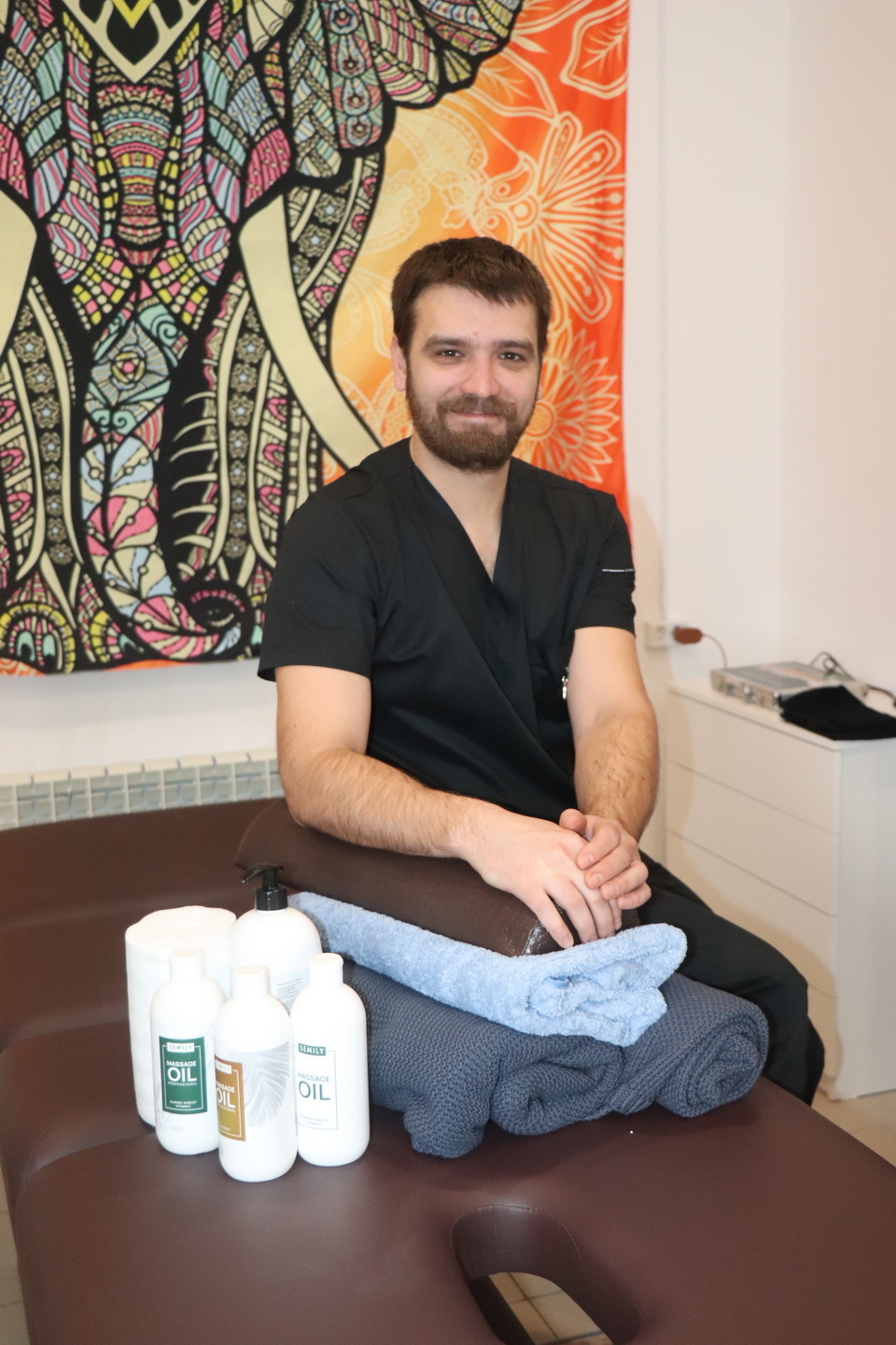 Сейчас массажист практикует также стоун-терапию (вид массажа, при котором на тело воздействуют гладкими тёплыми камнями) и проводит сеансы ароматерапии.