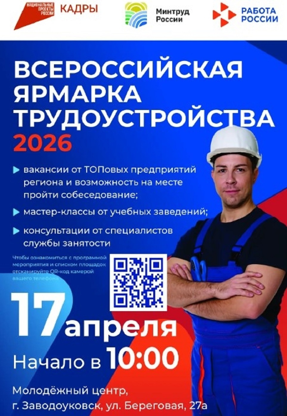 Сегодня, 17 апреля, с 10.00 до 15.00 по адресу: ул. Береговая, д. 27а (центр развития детей и молодёжи) работодатели представят землякам вакансии, которые есть в их организациях.